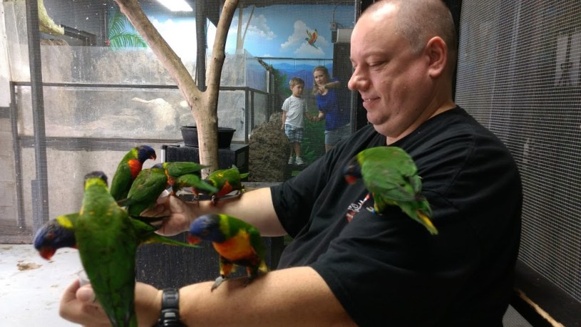 Turns out you can — for an extra fee — feed fish, stingrays, sharks, lorikeet, parakeet, iguana, koi, and turtles! Here’s Shawn feeding the lorikeet. (Warning, turn the volume DOWN first.)