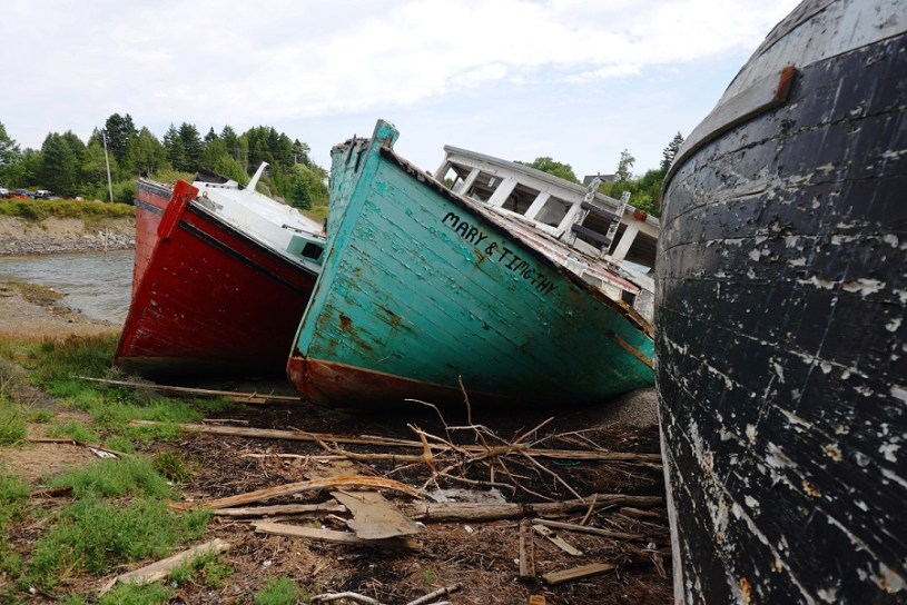 In addition to the wharf, there are a couple of coves that apparently act as burial grounds for abandoned fishing boats. When we spotted one of these, I had to take time to clop around on the rocky, overgrown beach and take some photos.